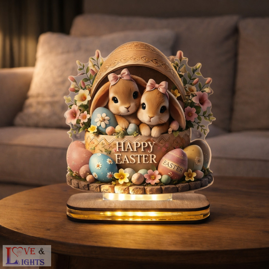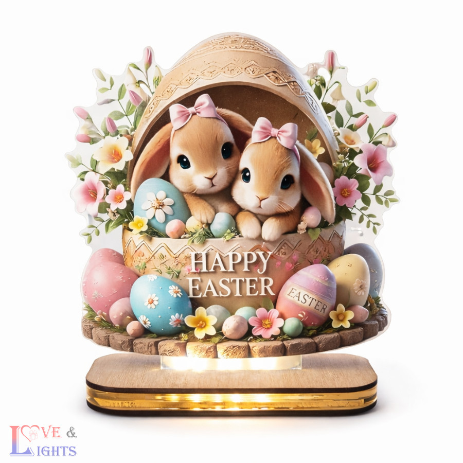 A húsvéti nyuszik tojásban mintás LED éjjeli fény igazi tavaszi kedvenc, amely mosolyt csal kicsik és nagyok arcára egyaránt. A cuki nyuszi figura, a színes tojásmotívum és a Happy Easter felirat vidám, ünnepi hangulatot teremt, miközben a meleg fehér fény kellemes, megnyugtató világítást biztosít.