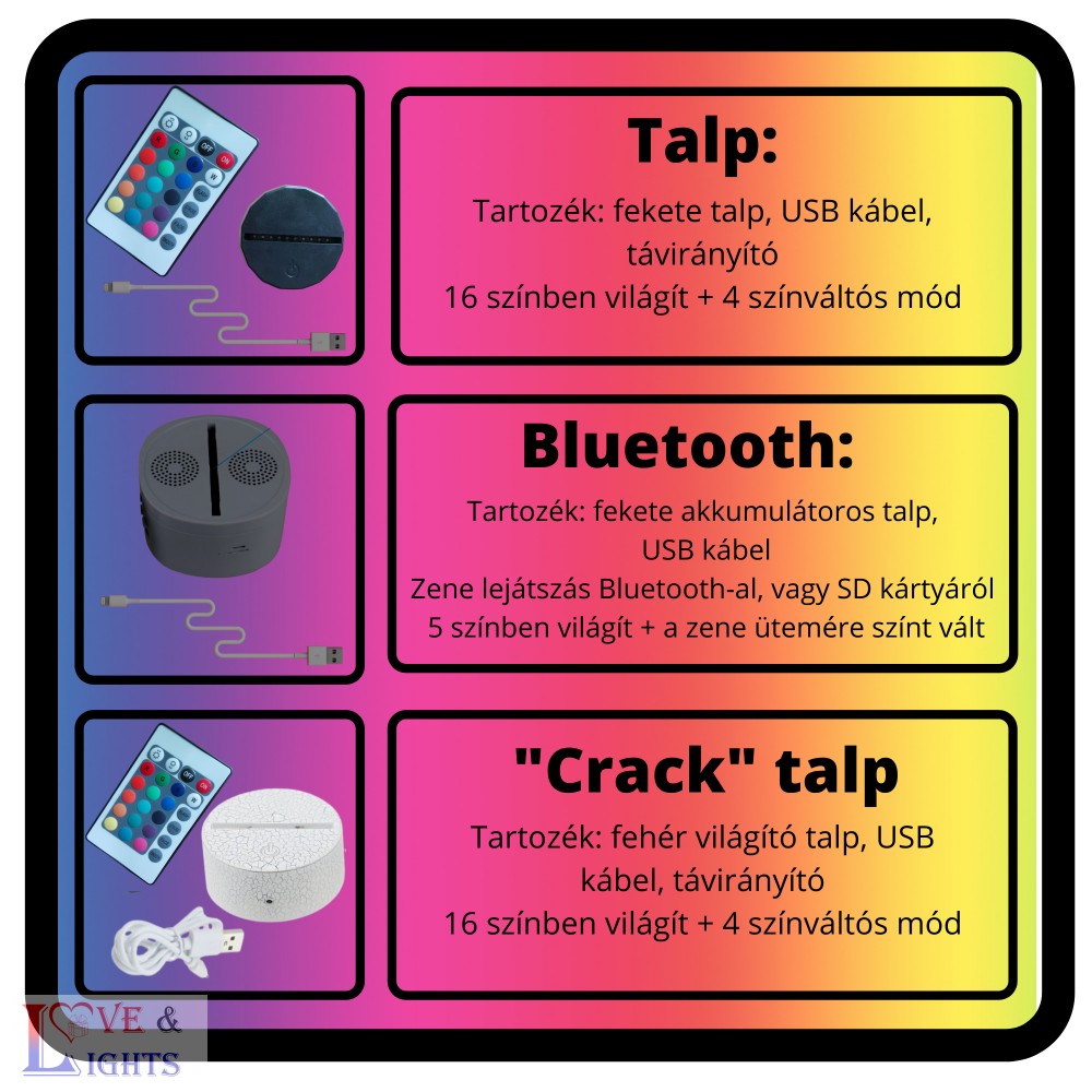 A termékleírás alatt, a "Talpak" menüpontban még többet megtudhatsz 3D lámpáinkró, a különböző talpakról és videón mutatjuk be működésüket.