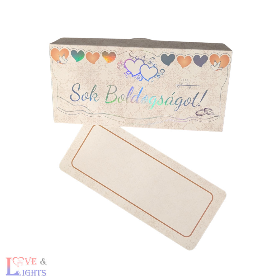 A boríték belsejében egy dísz kártya is található, ahová saját kézzel írhatod a jókívánságokat – így a pénzajándék átadása még személyesebb és meghatóbb élmény lesz.
