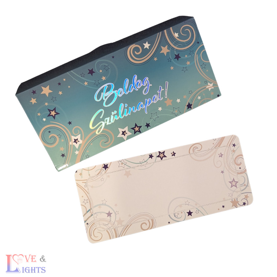 A borítékhoz tartozik egy dísz kártya, amelyre saját kezűleg írhatod rá a jókívánságokat, így az ajándék igazán személyessé válik.